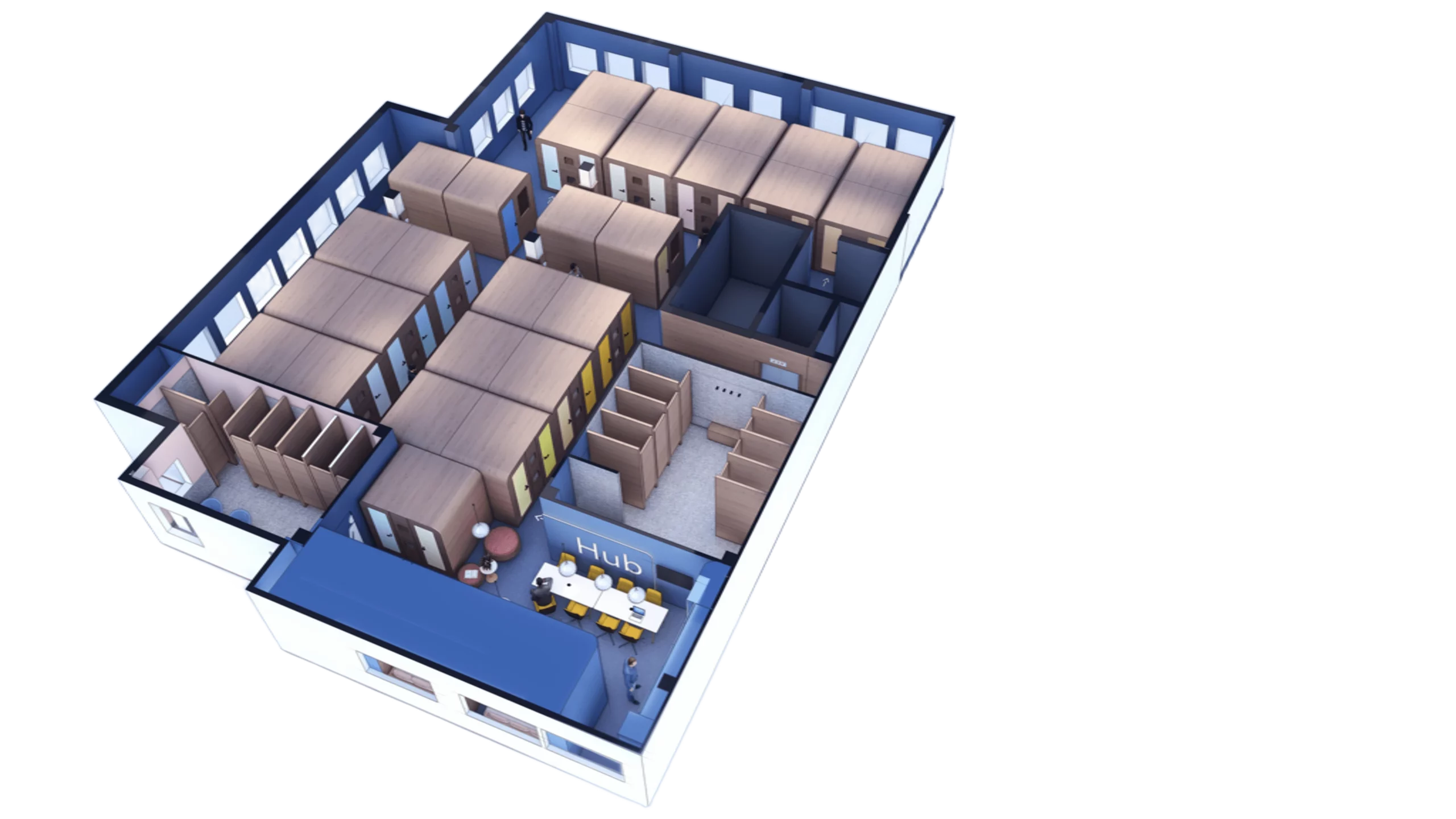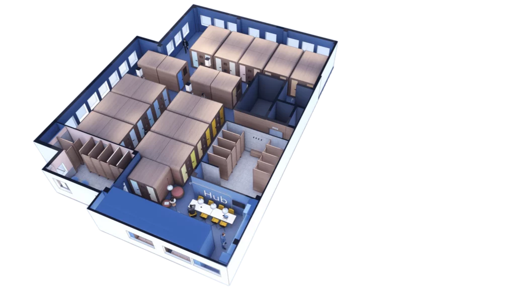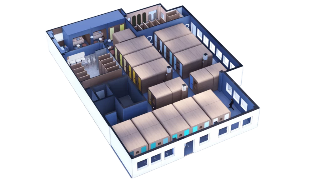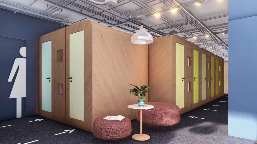 The hotel features 50 sleeping units, arranged efficiently within a vibrant shared interior. Each capsule is thoughtfully designed to provide comfort while maximising space, with rounded tops, soft finishes, and colour-themed rows that give rhythm and identity to the layout. Alongside the compact capsules, a few larger private units offer guests a more spacious option.