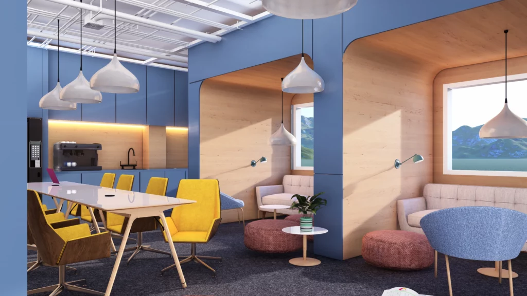 Beyond the sleeping pods, the interior encourages connection and relaxation. A shared kitchen, cozy window booths, and warm wood finishes create welcoming spaces for guests to unwind. The bold palette of deep blues, sunny yellows, and coral tones, combined with organic curves, makes every corner feel lively yet considered.